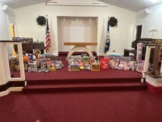 gifts, games, coloring books and stuffed animals were laid out in the Chapel of Naval Weapons Station Earle. The gifts were those collected at St Dennis’s RC Church in Manasquan with another 350 games and coloring books donated by Scott Aitken.
